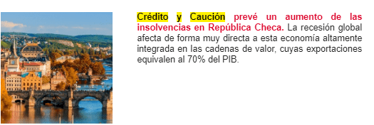 Crédito y Caución prevé que la economía checa registre una contracción del 6% en 2020, con caídas de dos dígitos tanto en su producción industrial como en el comercio exterior. La recesión global afecta de forma muy directa a este mercado altamente integrado en las cadenas de valor, cuyas exportaciones equivalen al 70% del PIB. La aseguradora de crédito prevé que la morosidad y las insolvencias de empresas aumenten en los últimos meses de 2020 y principios de 2021, especialmente en los sectores más afectados por la recesión económica: automoción, construcción, maquinaria, metalurgia, acero, y servicios.