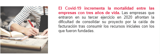La mortalidad de las empresas en su tercer año de vida, el momento crítico en el que muchas de ellas agotan sus recursos iniciales, se ha disparado cinco puntos en 2020. Esta es una de las conclusiones del último estudio realizado por Iberinform sobre longevidad empresarial, que estudia cada año las tasas de mortalidad de los proyectos empresariales. El tercer año es el más crítico en todo proyecto empresarial: la inyección inicial de capital permite a la inmensa mayoría cumplir sin problemas los primeros 24 meses de vida. Sin embargo, a partir de ese punto, aquellas empresas que no son capaces de generar números negros afrontan un futuro incierto.
