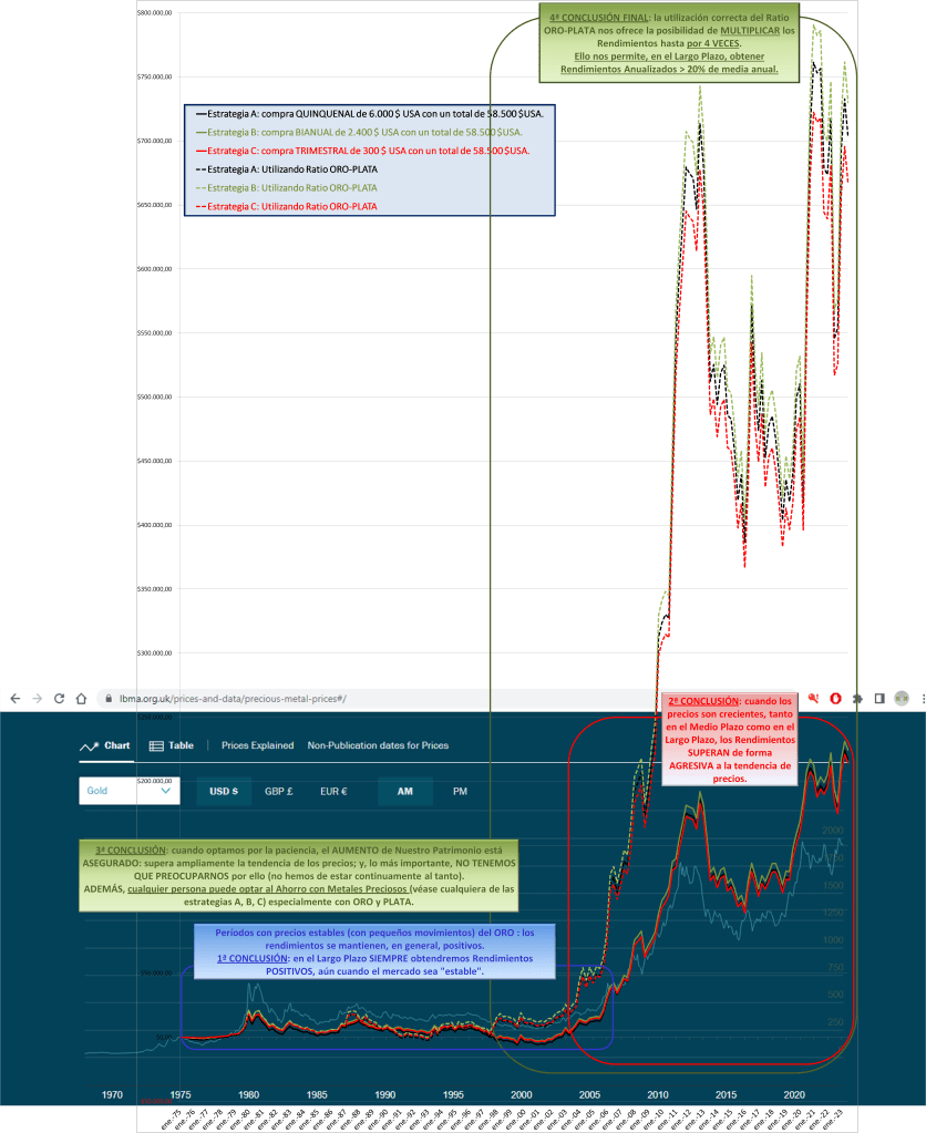- 3ª CONCLUSIÓN: cuando optamos por la paciencia, el AUMENTO de Nuestro Patrimonio está ASEGURADO: supera ampliamente la tendencia de los precios; y, lo más importante, NO TENEMOS QUE PREOCUPARNOS por ello (no hemos de estar continuamente al tanto). ADEMÁS, cualquier persona puede optar al Ahorro con Metales Preciosos (véase cualquiera de las estrategias A, B, C) especialmente con ORO y PLATA.