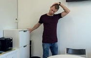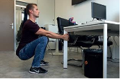 Partiendo de la posición de pie, debe agacharse lo más que pueda y agarrarse a un soporte sólido (la pata de una mesa, un mueble…) que le ayude a mantener la postura con los brazos estirados. Una vez en cuclillas, estírese para poner la espalda recta y mantenga los talones firmemente apoyados en el suelo.